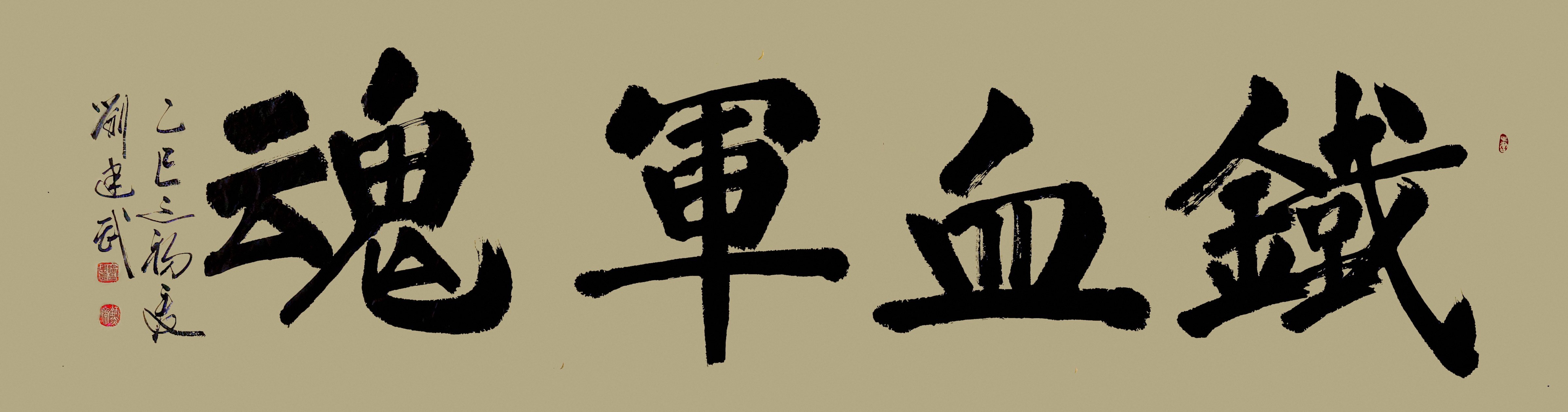 “创新,要立足中华文脉,回归优良传统,决不能丢根失魂、胡写乱画。”虽然已对书法有很高造诣,但刘建武仍坚持临帖,或取其势,或取其韵,或取其结构分布。“书法作品应是厚重而不沉重,飘逸而不轻佻,周正而不呆板,古朴而不呆滞。”创作中,他博采众长,取篆书的古朴、行书的灵动、隶书的雄浑、楷书的典雅,并赋予军人特有的风骨,使其字如歌、如啸、如舞、如奔,达到“聚德博精,厚重完美”的境界。