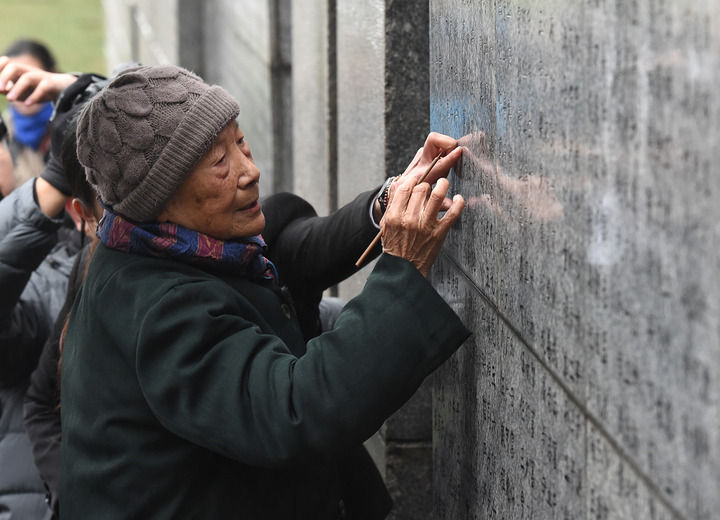 2018年12月10日,在侵华日军南京大屠杀遇难同胞纪念馆举行的死难者遗属家祭活动中,夏淑琴给遇难者名单墙上亲人的名字添漆。新华社记者 孙参 摄