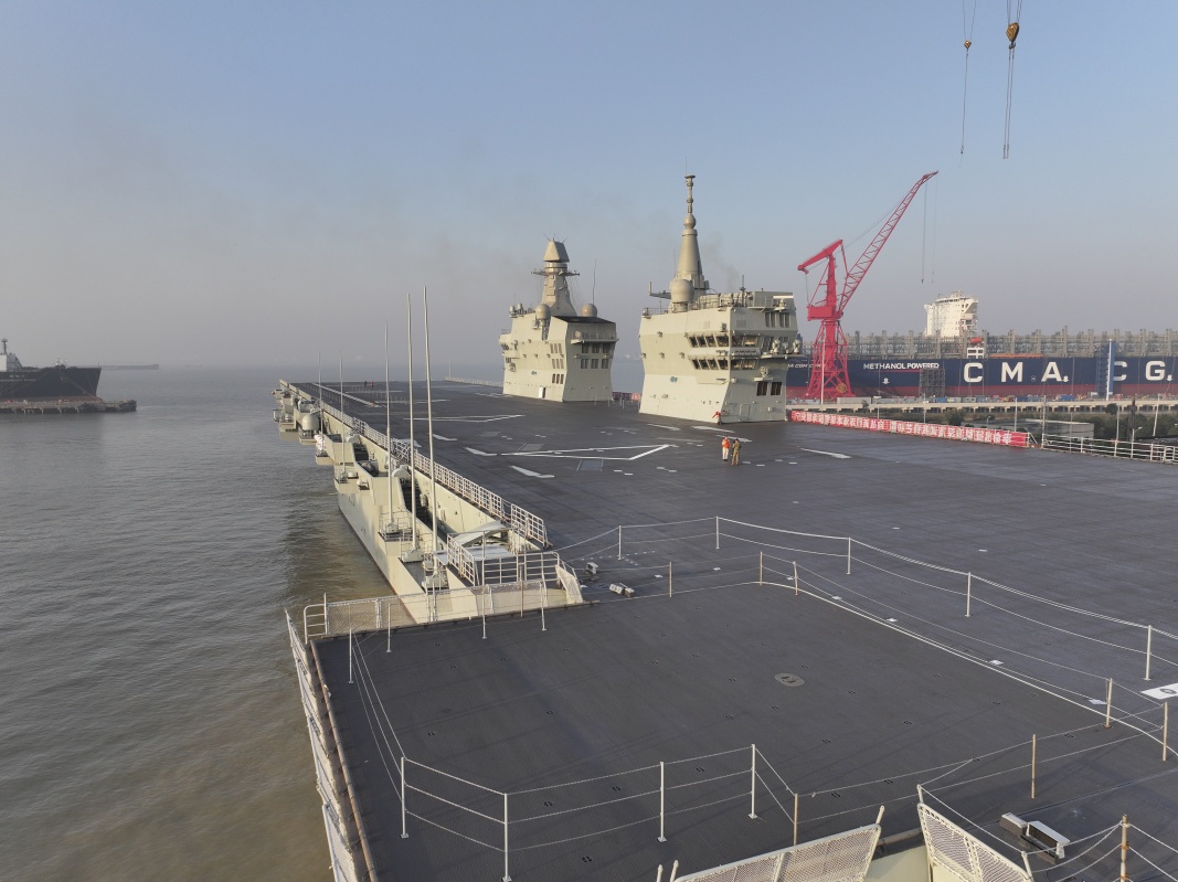 11月14日9时许,我国076两栖攻击舰首舰四川舰从上海沪东中华造船厂码头解缆启航,赴相关海域开展首次航行试验任务。新华社发(张良 摄)